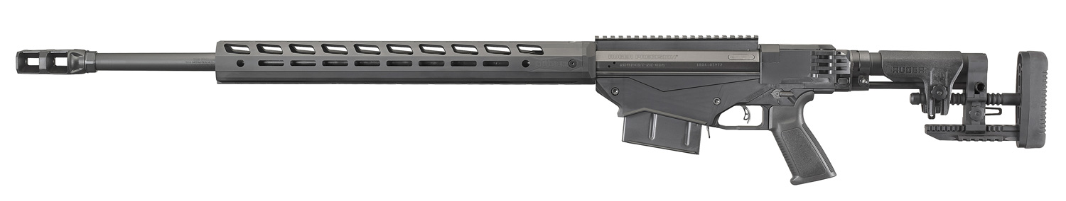- Heavy-contour (.875″ at the muzzle) barrel features a Ruger Precision Rifle Magnum Muzzle Brake with tunable compensator to effectively reduce recoil and muzzle jump.
